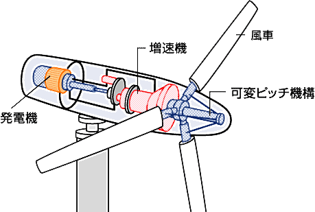 風の力を利用して風車を回し、風車の回転運動を発電機に伝えて電気を起こします。自然のエネルギーを利用するため、なくなる心配がない。発電時に二酸化炭素などをださないため、環境にやさしい。風力発電機は、風の強さや向きをはかり、羽根の角度や風車の向きを自動的に調整して、効率的に発電します。風車の回転軸により水平型、垂直型があり、風車の種類もプロペラ型のほかに、タリウス型などさまざまな構造があります。